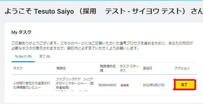 Step4. アカウントが作成され、候補者ホーム(マイページ)が表示されます。応募ポジション名を確認し、アクション欄にある「完了」ボタンをクリックし、あなたの個人情報入力ページを表示させてください。 |