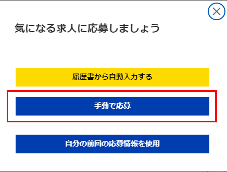 3.「応募」を押すとポップアップが出てきますが、必ず「手動で応募」を選んでください。新卒採用の場合は履歴書の提出は不要となります。※「履歴書から自動入力する」を選ぶと履歴書の提出が必須となってしまいますのでご注意ください。提出頂いたとしても採用担当が履歴書を拝見することはありません。 ※既に「手動で応募」を使用しP&Gに応募したことのある方は、「自分の前回の応募情報を使用」を選んでください。自動的に個人情報が復元されます。 ※システム変更により2021卒・2022卒採用にて応募いただいた方の個人情報は自動的に復元されませんので、「手動で応募」をお選びください。 |