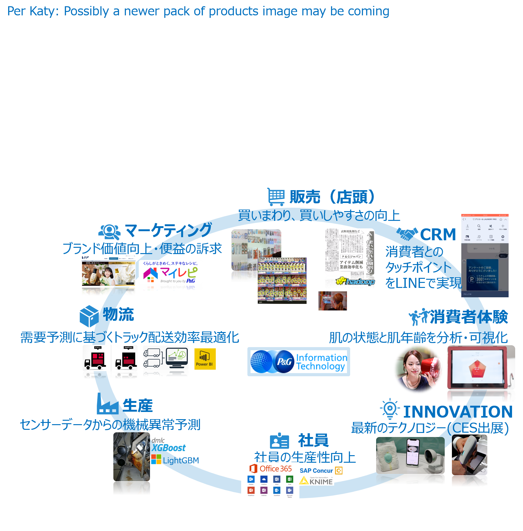 ITはこれらの新たなビジネスニーズと情報テクノロジーの可能性を融合し、P&Gのビジネスモデルに革新をもたらす役割を担っており、ITが果たすべき役割は益々大きく、重要になってきています。