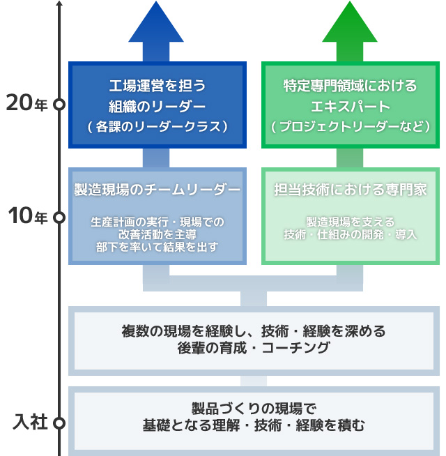 キャリア全体を通して高度な専門技術・経験を培っていく中で、生産システム全体の広範な理解の下で組織・チームを率いて結果を出していくリーダーになるか、特定の専門技術領域を極め、その道の第一人者として活躍するリーダーになるか。キャリアアップしていく中で、あなた自身がどうなりたいか選ぶことができ、それに沿った育成プランや職務を経験していくことができます。